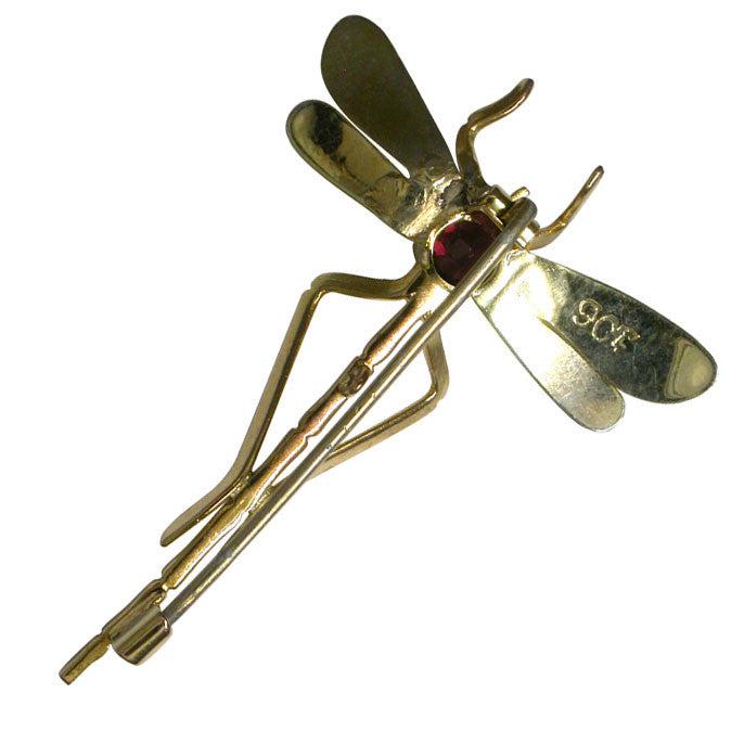 Dragonfly Stock Pin, tested with acid and marked '9ct' yellow gold, set to centre with a single garnet circa 1910