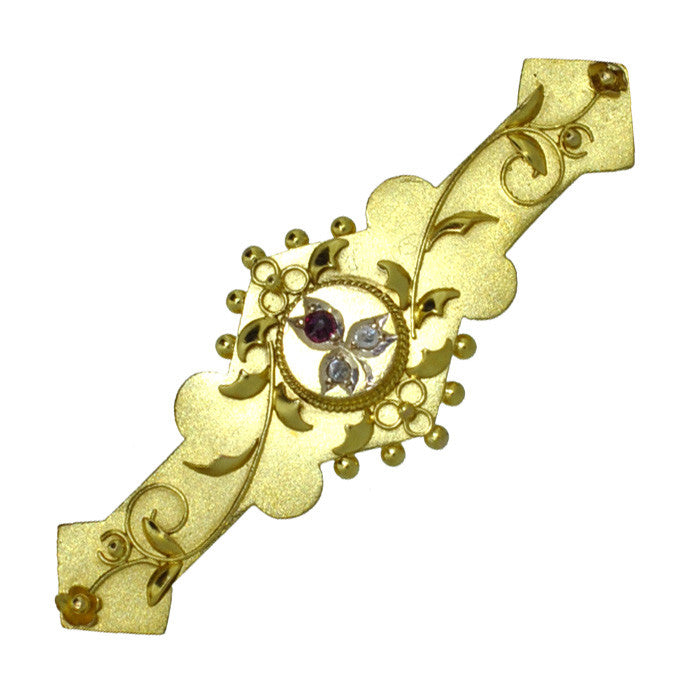 15ct Gold fancy bar a single ruby and two rose cut diamonds set to the centre. Hallmarked Birmingham 1906