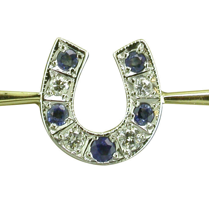 9ct yellow and white gold hallmarked and dated Birmingham 1971, stock pin with diamond and sapphire set horseshoe to the centre of a plain bar, with a safety catch