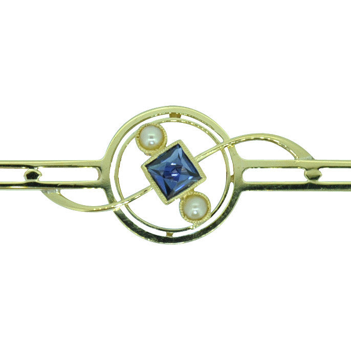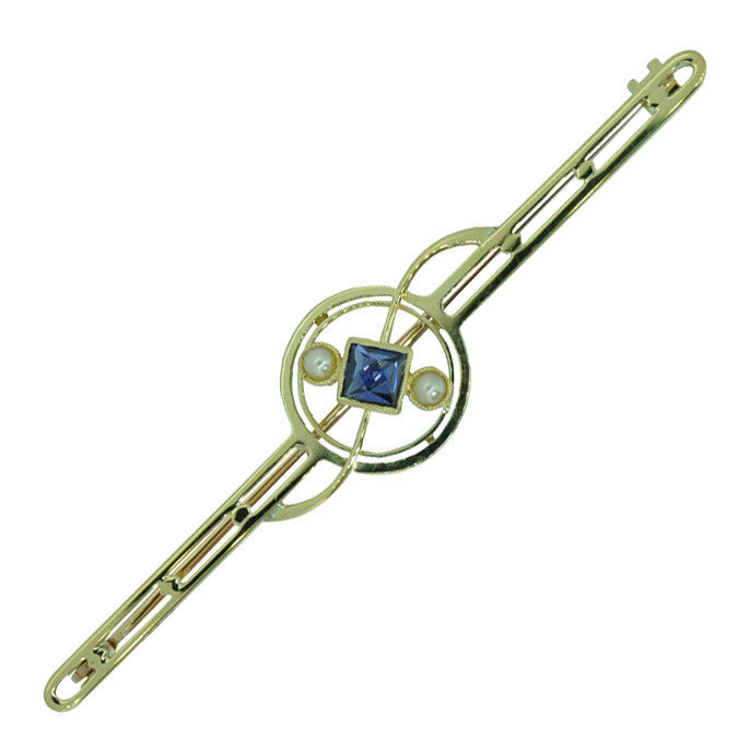 Stock Pin set with a square sapphire and two pearls, tested with acid and marked as '15ct', circa 1910, with safety catch