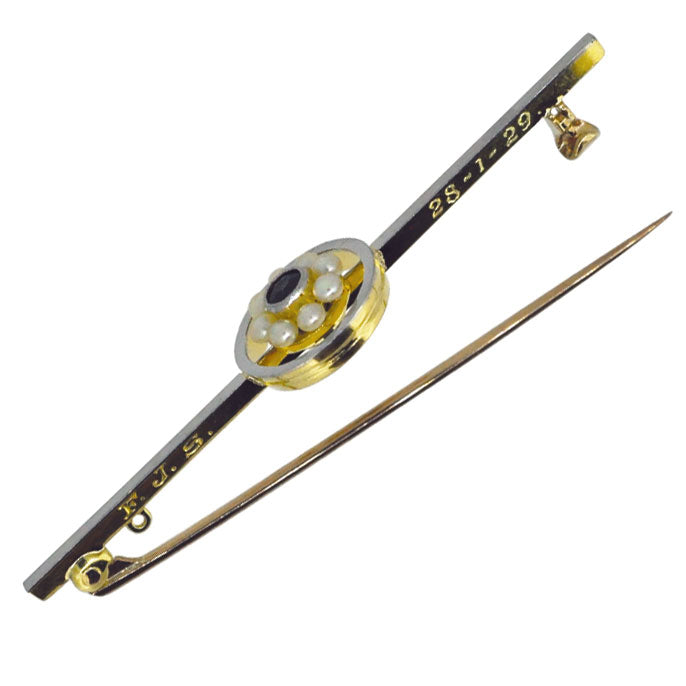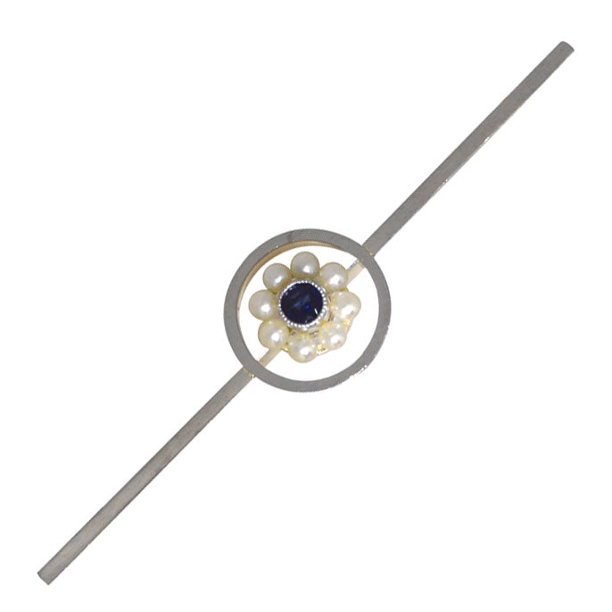 15ct Yellow gold and platinum stock pin. A plain bar with a single sapphire set to the centre in a rub over setting, surrounded by a circle of eight pearls, within a gold and platinum halo. With safety catch.