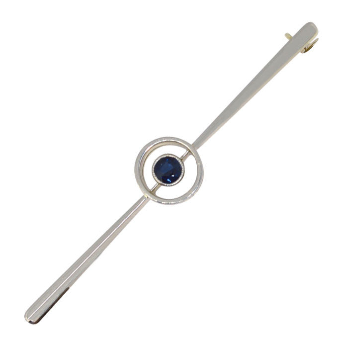 15ct Yellow and white gold bar with a sapphire set to the centre in a rub over setting within a circle on the bar. With safety catch, circa 1930s.