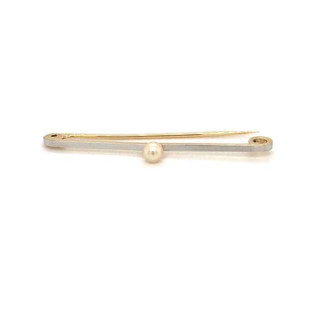 Single pearl set to the centre of a plain bar, tested with acid as 18ct platinum and yellow gold, marked '18ct PLAT'. Circa 1930s.