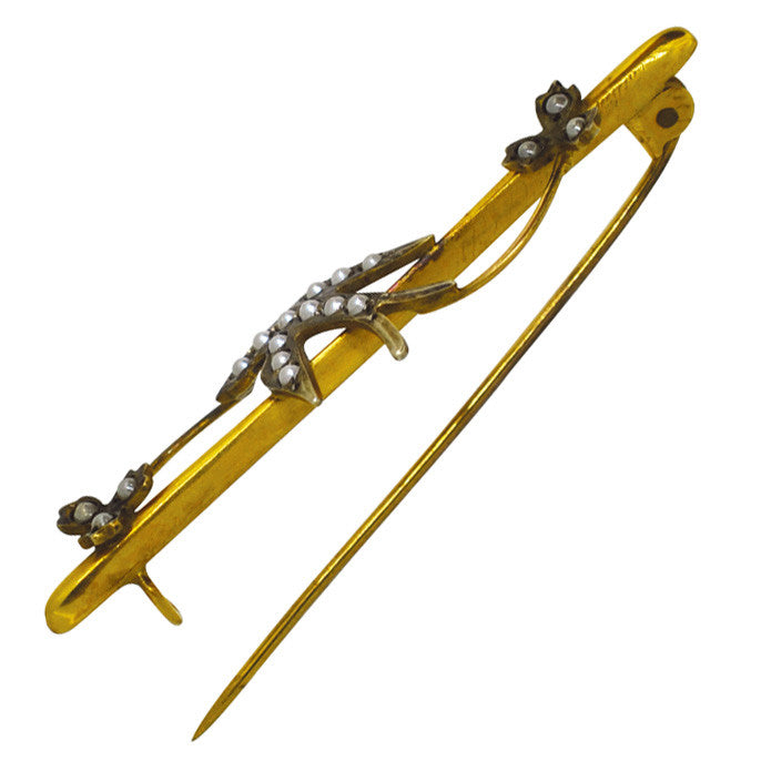 Pearl set 'bird' stock pin. Marked '9ct' and tested as 9ct yellow gold, circa 1910.