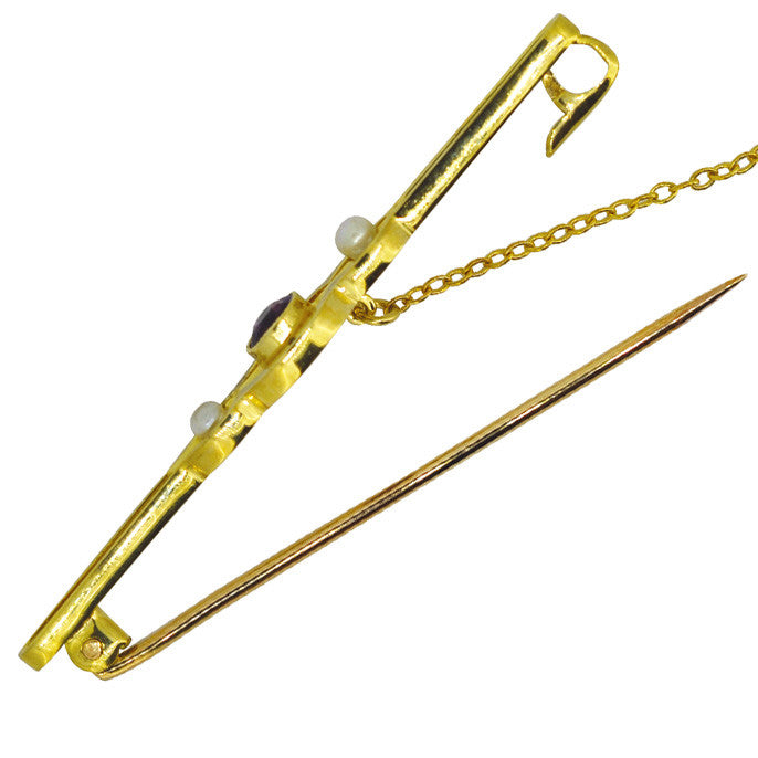 Stock Pin set to centre with a single amethyst with a pearl each side, marked '15t' and tested with acid as 15ct yellow gold circa 1920's with a safety chain