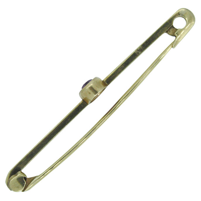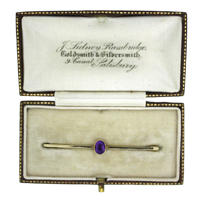 Stock Pin, a plain bar set to the centre with a single oval amethyst, tested with acid and marked as '9ct', circa 1920's in original old box
