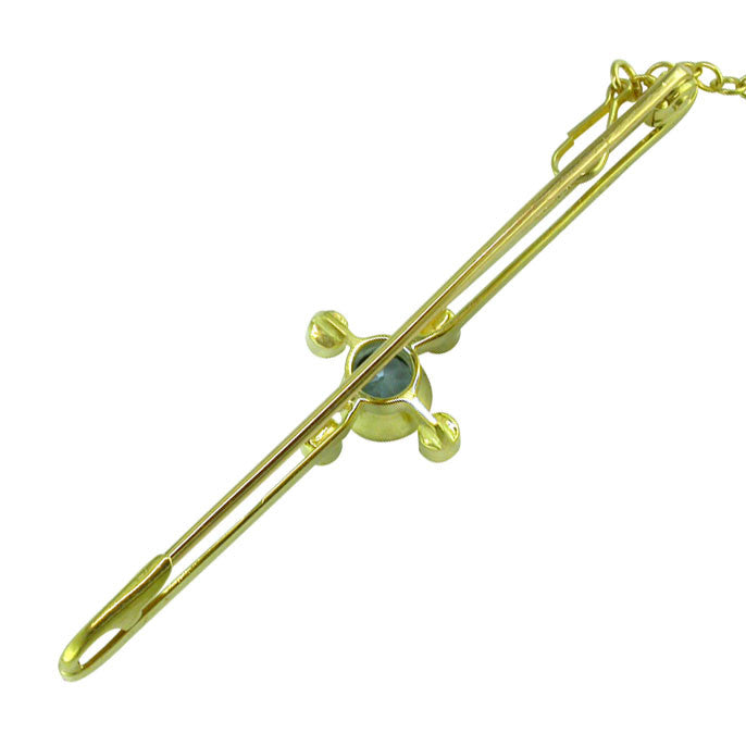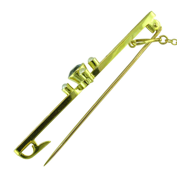 Aquamarine and Pearl set stock pin, tested with acid and marked '15ct', circa 1930's, with safety chain