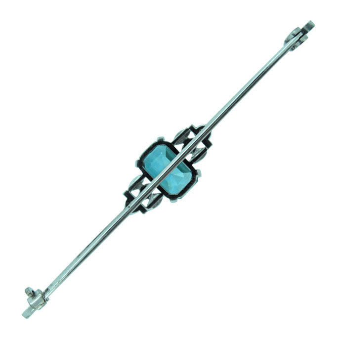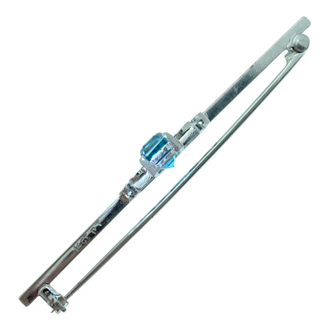 Stock Pin, plain bar tested with acid as 14ct white gold and marked '14ct', set to the centre with a fine coloured rectangular blue zircon, with a small diamond each side, circa 1930's, with safety catch