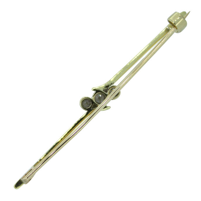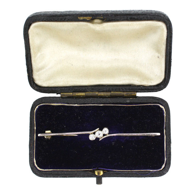 Diamond Stock Pin, a plain bar crossing to the centre set with three diamonds, tested with acid as 18ct yellow and white gold circa 1920's, in original old box