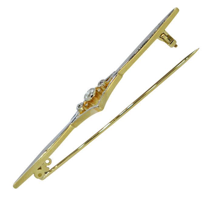 15ct yellow gold and platinum stock pin. Gold bar with platinum to the front with three diamonds set to the centre in rub over settings, with safety catch. Acid tested as 15ct gold and platinum. Circa 1930s.