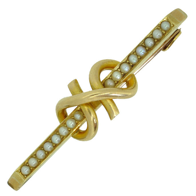 Victorian Stock Pin in the form of a plain knot around a pearl set bar, marked '15ct' and tested with acid as 15ct yellow gold, circa 1890