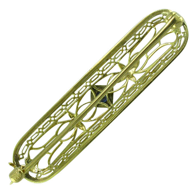 Stock Pin set to centre with single sapphire, in fancy filigree type surround, tested with acid and marked '14ct', yellow and white gold, with safety catch, circa 1930's