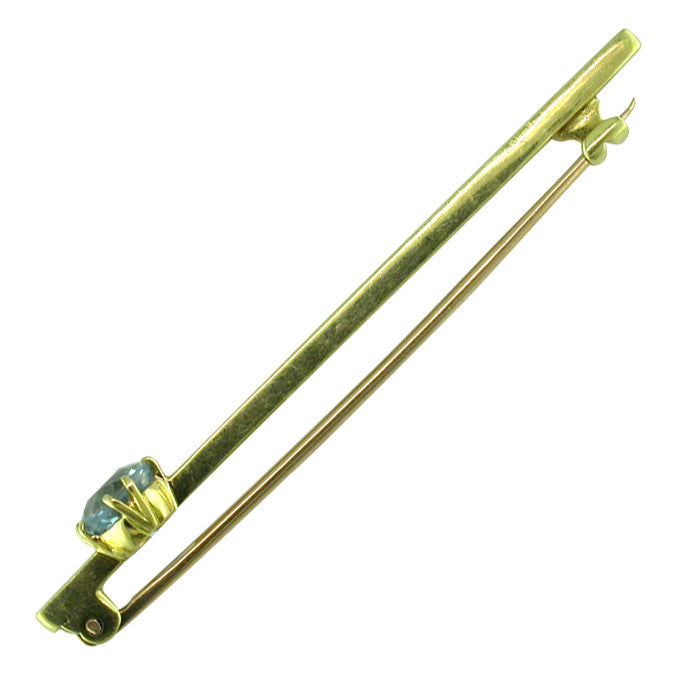 Stock Pin, plain bar tested with acid and stamped '18ct' yellow gold, claw set with single blue zircon, circa 1920's