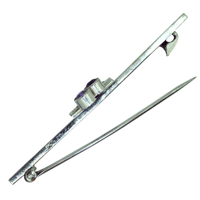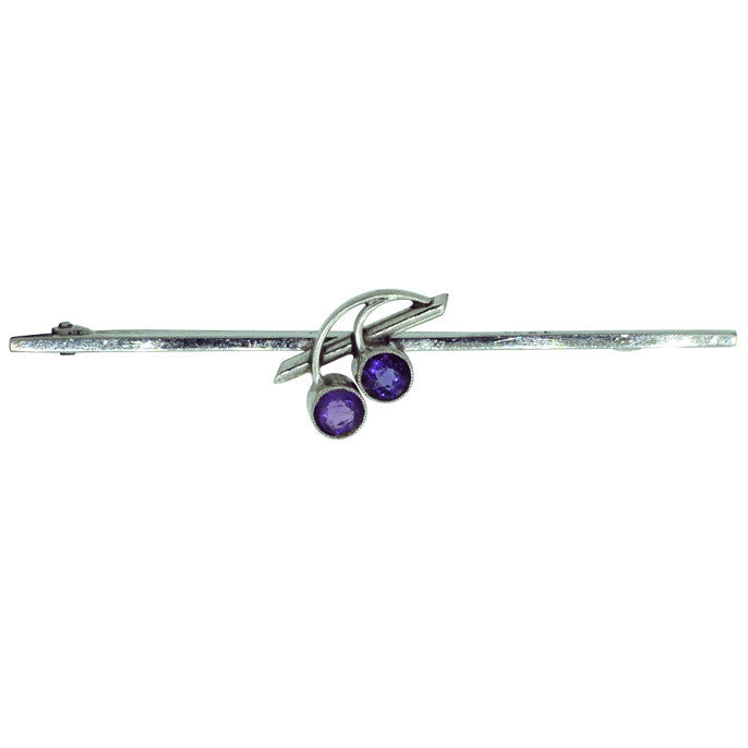 Stock pin with two amethyst to the centre. Marked and tested with acid as 9ct white gold. Circa 1930.