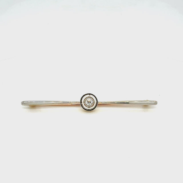 18ct Yellow and white gold stock pin with a single diamond (appx 0.16 cts Colour G, Clarity SI2) to the centre in a rub over setting surrounded by a white enamel band. Circa 1920s.