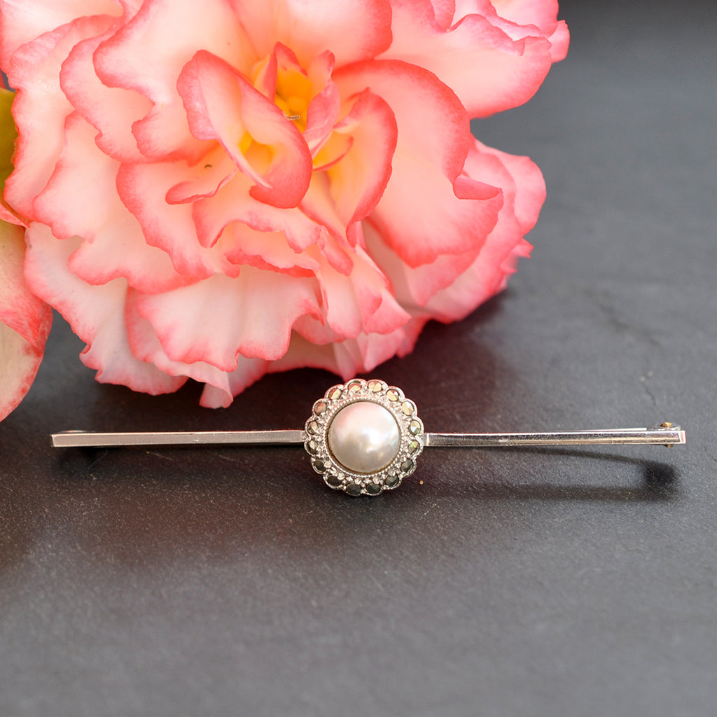 Silver marcasite stock pin with a mabe pearl set to the centre of the bar.