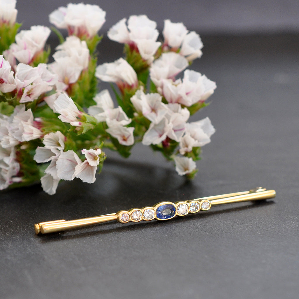 18ct Yellow gold stock pin with a single oval sapphire to the centre and three oval diamonds to each side in rub over settings. Hallmarked and dated Sheffield UK 1992.