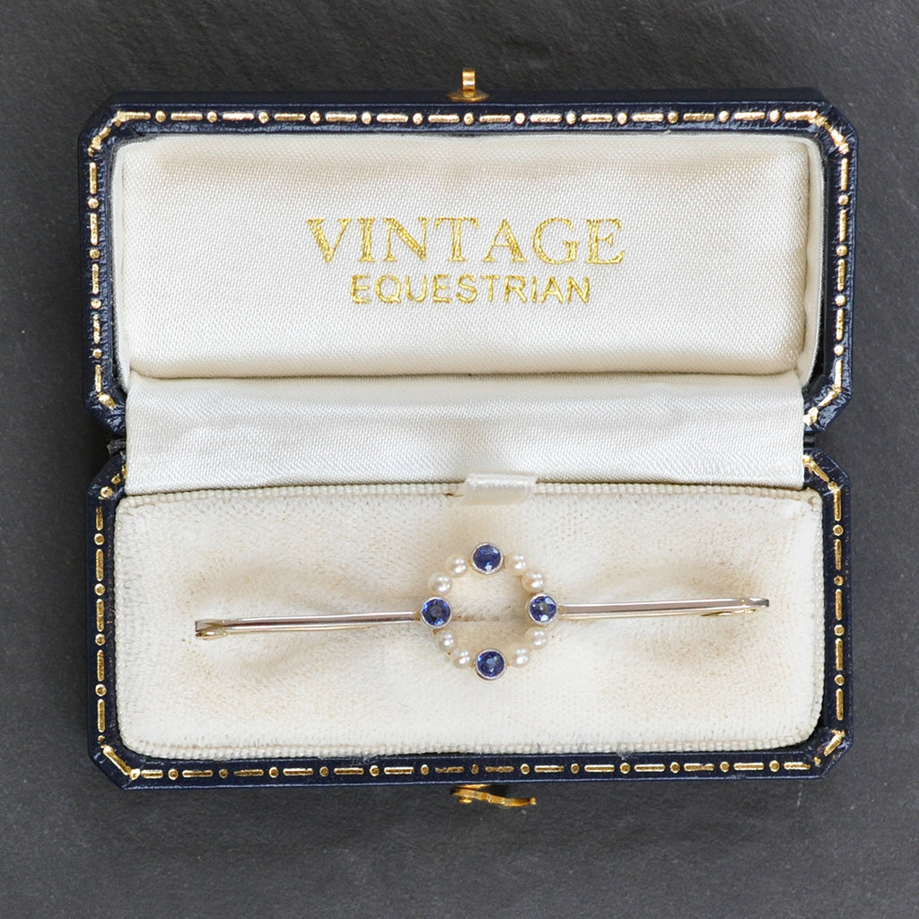 15ct Yellow gold and platinum bar with a twelve stone perl and sapphire circle to the centre. Circa 1930s.